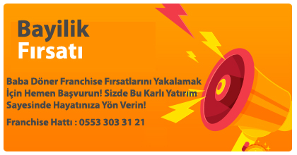 Türkiye’nin en güvenilir, helal sertifikalı firmalarında özenle hazırlanan etlerimiz, şubelerimize taze olarak ulaştırılır ve ustalarımız tarafından günlük olarak şişe takılır. Alanında uzman, deneyimli ve gerekli eğitimlere sahip uzman çalışanlarımızın hazırladığı ürünleri tüm hazırlık aşamalarında temizlik ve hijyen kurallarına uygun olarak servis edip, şubelerimize ulaştırmaktayız. Baba Döner ailesine katılıp, sektörün lideri olma yolunda hızlı adımlarla ilerlemek istiyorsanız bizimle iletişime geçmekten çekinmeyin. Unutmayın kalite asla tesadüf değildir. Dönerin Babası Babadöner.